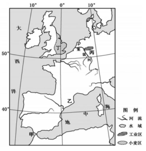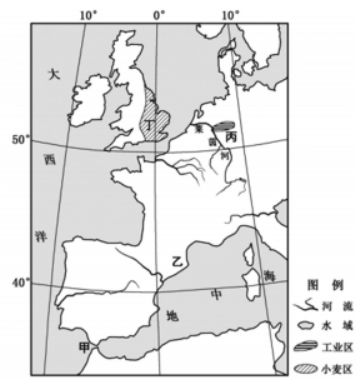 (4)从气候角度分析英国小麦主产区分布在丁地的原因。