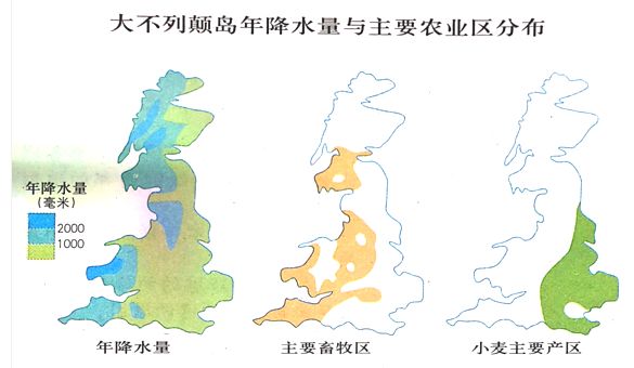 该题的原图就是来自高中地理必修三配套地图册第14页“大不列颠岛降水量与主要农业区分布”图。