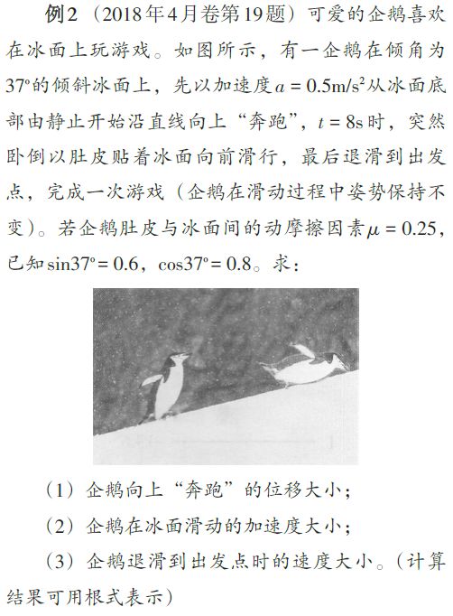 题目的第二问问的是企鹅在冰面滑动的加速度大小,很多考生解题时只求解了企鹅贴着冰面向前滑行的加速度大小,而没有求解企鹅滑到最高点后姿势不变下滑时的加速度大小。