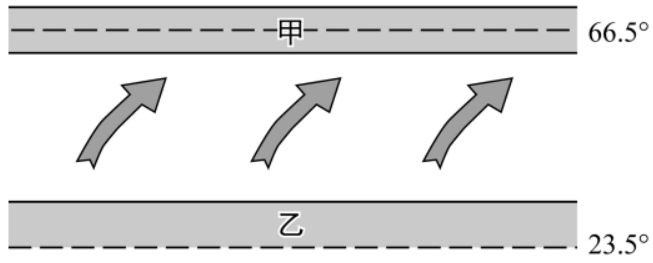 例2 (2017.11)下图为某半球气压带、风带(箭头表示风向)分布局部示意图。完成11、12题。