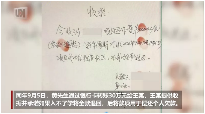 同年9月5日,黄先生通过银行卡转账30万元给王某,王某提供收据并承诺如果入不了学将全款退回,后将款项用于偿还个人欠款。久未等到录取通知书的黄先生要求退款,王某多次以学校处理中等借口拖延,直到无法圆谎将黄先生拉黑。后黄先生报警案发,王某被抓获归案。