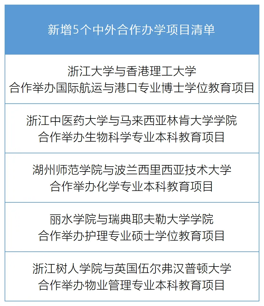 近日,教育部公布了2025年下半年获准的本科及以上层次中外合作办学机构和项目名单。我省共新增北京航空航天大学中西智能学院、杭州电子科技大学都柏林电子信息工程国际学院、中国计量大学安格利亚罗斯金联合学院、台州学院圣伯纳迪诺理工学院等4所中外合作办学机构和浙江大学与香港理工大学合作举办国际航运与港口专业博士学位教育项目等5个中外合作办学项目。