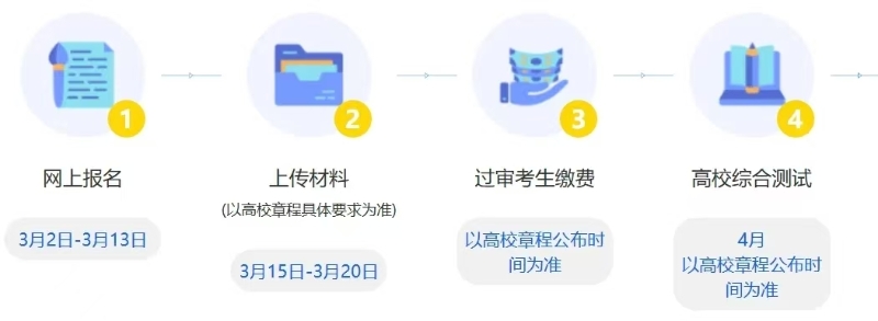 3月2日9:00—3月13日17:00,考生须按高校招生章程要求登录有关高校网站进行网上报名。当报考高校总数超过限报数量时,系统会进行提示。今年优化了考生报名信息采集,考生不需要多头重复填报高考报名信息、学考成绩、综合素质评价等基础信息。网上报名时间内,考生可对报考高校、报考专业等信息进行修改,报名截止后不得更改。