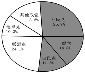20.(2022辽宁)某国大选各主要政党支持率如图所示。社民党积极回应选民社保诉求,获得了26%的工人群体和23%的失业群体的支持。因所获议席未过半数,社民党最终与绿党、自民党组成新一届联合政府,该党候选人出任总理。