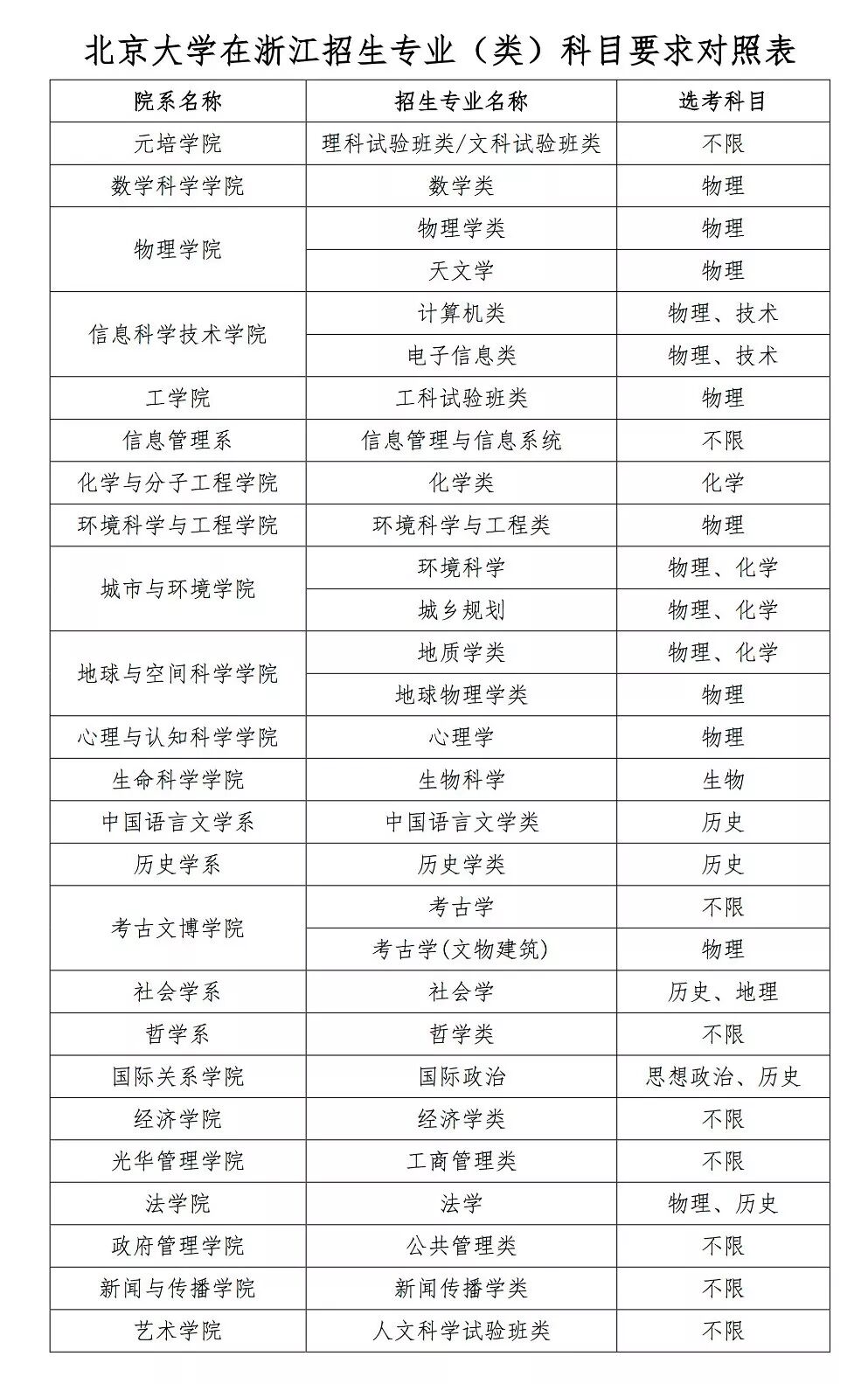 附件:北京大学在浙江招生专业(类)科目要求对照表